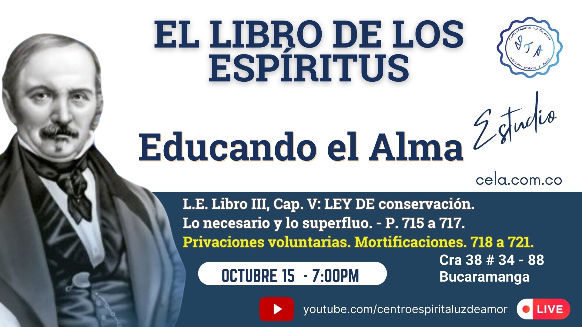 octubre 15 -7:00 PM L.E. Libro III, Cap. V: LEY DE conservación. Lo necesario y lo superfluo. – P. 715 a 717. Privaciones voluntarias. Mortificaciones. 718 a 721. Centro Espírita Luz de Amor Cra 38 # 34 -, Bucaramanga, Santander, Colombia Estudios