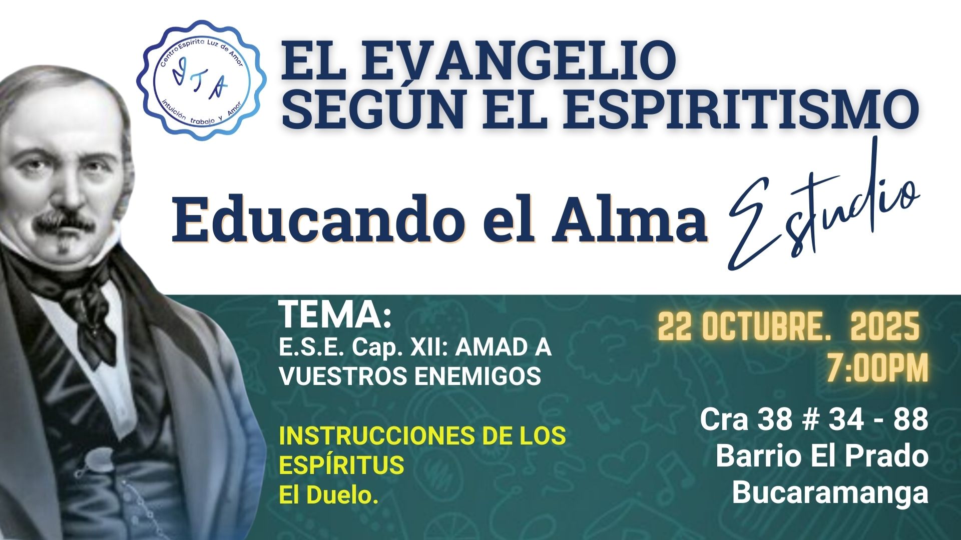 octubre 22 -7:00 PM E.S.E. Cap. XII: AMAD A VUESTROS ENEMIGOS INSTRUCCIONES DE LOS ESPÍRITUS El Duelo. Centro Espírita Luz de Amor Cra 38 # 34 -, Bucaramanga, Santander, Colombia Estudios