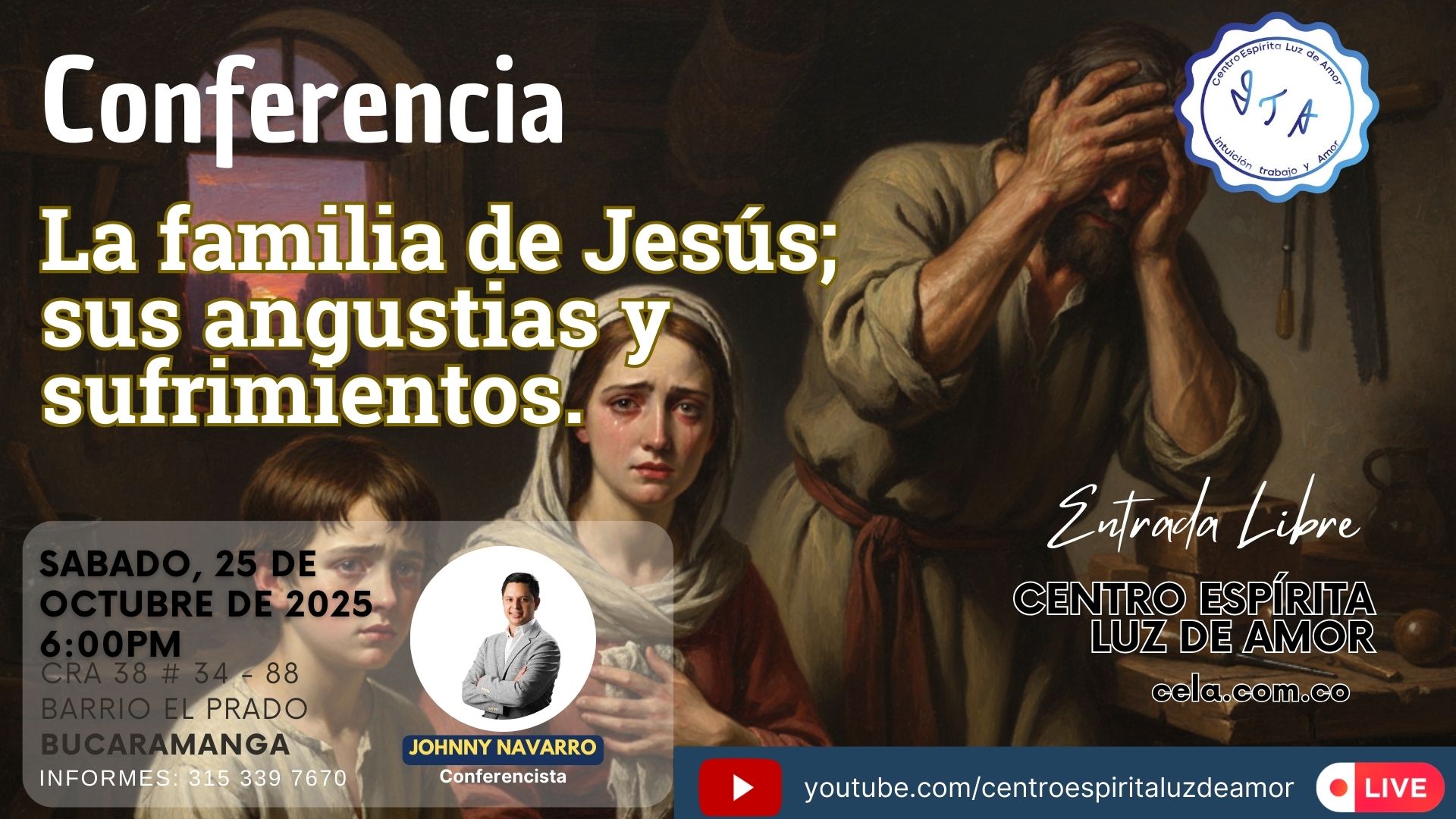 octubre 25 -6:00 PM La familia de Jesús; sus angustias y padecimientos Centro Espírita Luz de Amor Cra 38 # 34 -, Bucaramanga, Santander, Colombia Conferencias