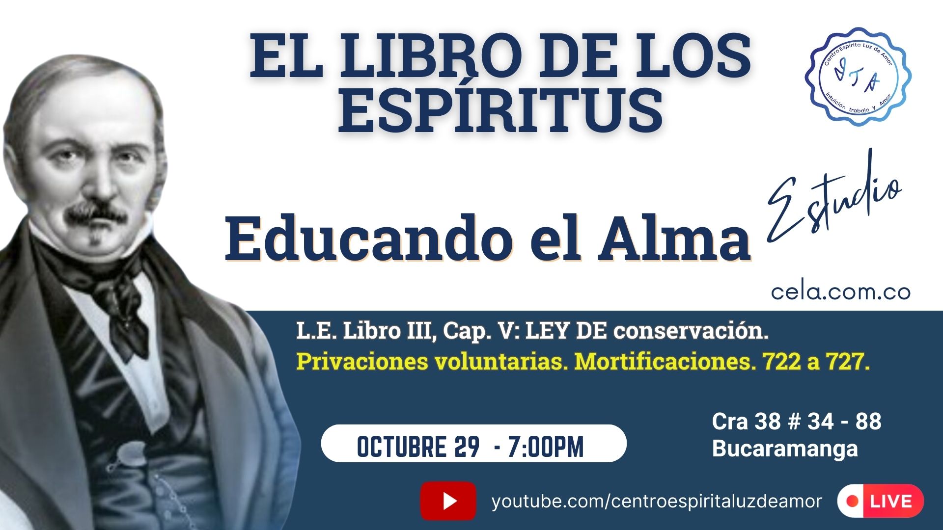 octubre 29 -7:00 PM L.E. Libro III, Cap. V: LEY DE conservación. Privaciones voluntarias. Mortificaciones. 722 a 727. Centro Espírita Luz de Amor Cra 38 # 34 -, Bucaramanga, Santander, Colombia Estudios